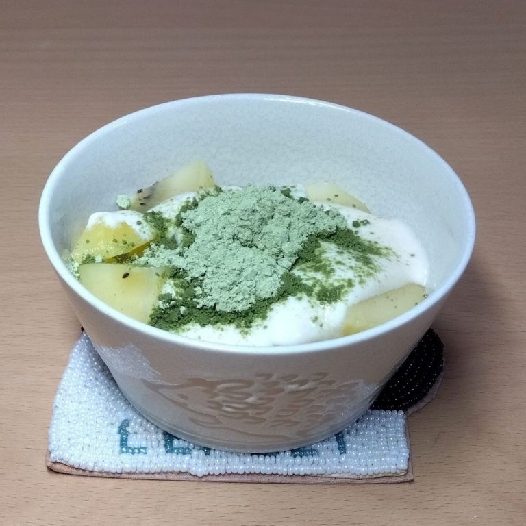 粉が沈むので混ぜながら飲むのがポイントです。 - ヨーグルト(写真は豆乳ヨーグルト)に振りかけて!ヨーグルトやフルーツの味を邪魔しません。